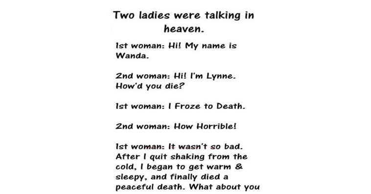 1st woman: Too bad you didn’t look in the freezer… we’d both still be alive.