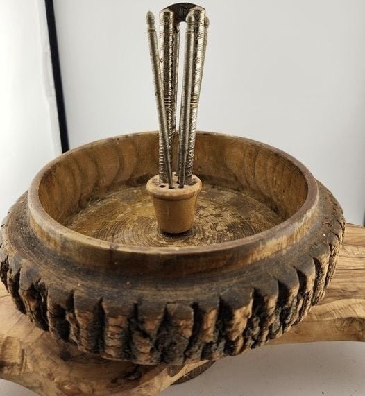 Additionally, the nutcrackers were frequently found with a wooden bowl that matched and was shaped like a chestnut.
