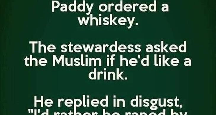 Paddy ordered a whiskey. The stewardess asked the Muslim if he’d like a drink.